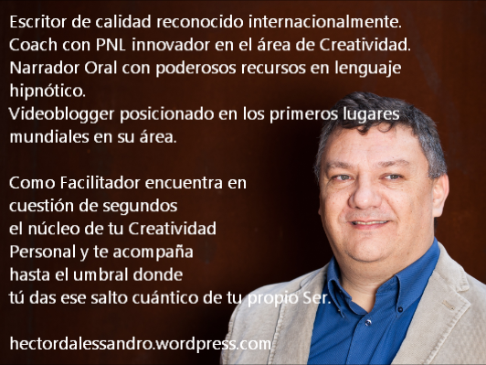 De entrada, en el blog Psicocuántico vemos una foto de Héctor D’Alessandro en una de sus mejores poses: atléticamente en cuclillas, su rostro redondo de hombre dichoso que no se decide a ser gordo, pero que nunca llegará a ser flaco; atléticamente en cuclillas, repito, como si fuera el fichaje más reciente del Barça; su rostro redondo, su bonhomía de oso panda, su pelo ligeramente rizado. Y abajo leemos: Héctor D’Alessandro. Coaching para escribir y PNL. Más abajo anuncia que en tres horas, con su asesoría, un alumno puede absorber la información necesaria para escribir Rayuela o el Ulises de Joyce. Por más inverosímil que sea la propuesta, yo les aseguro que si hablan con Héctor, terminarán convencidos.